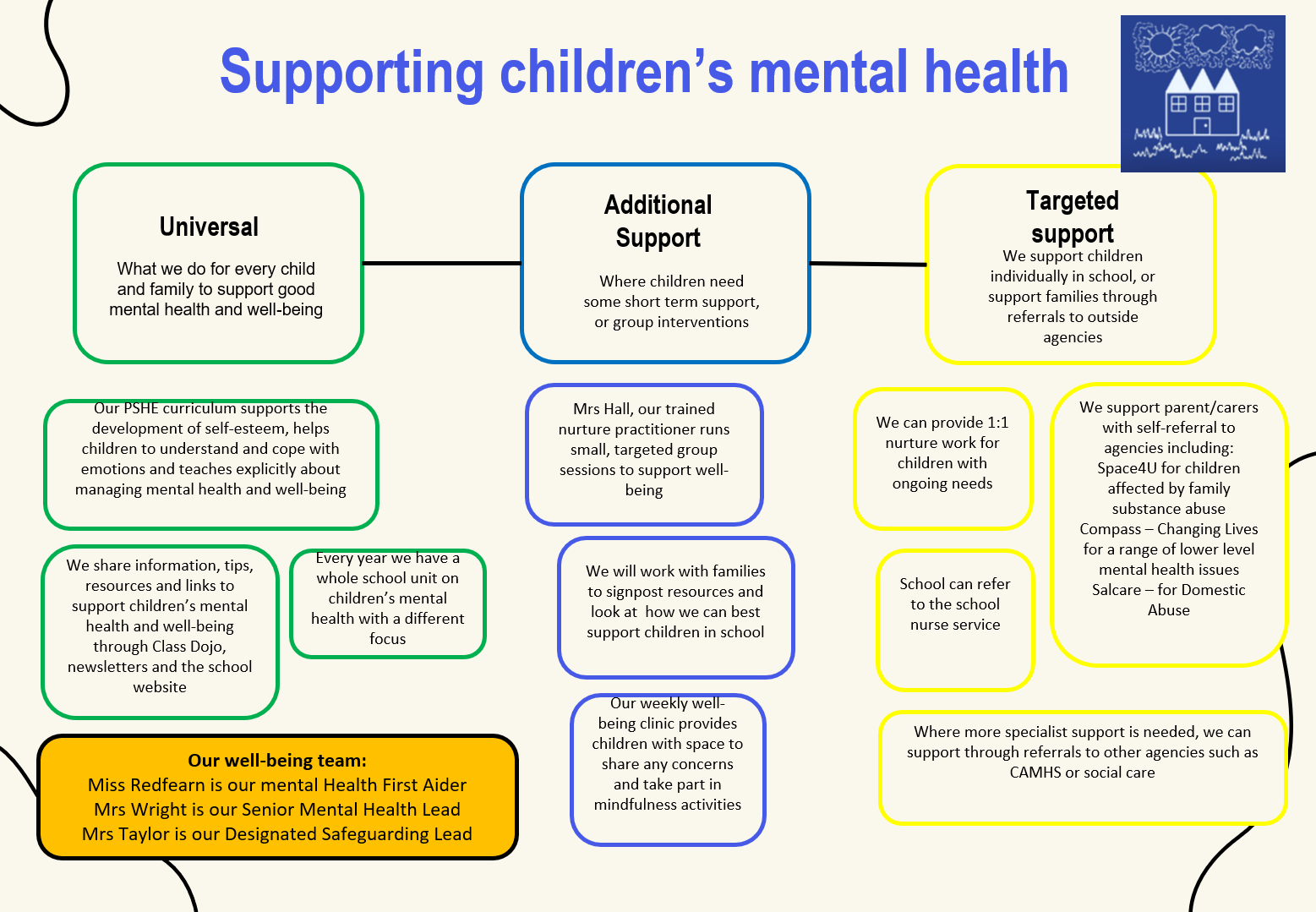 Miss Redfearn is our school's Mental Health First Aider. Each Friday lunchtime, she hosts a 'Wellbeing Clinic' for the children where they can drop in and speak to her about anything wellbeing related. This provides another opportunity for the children to feel heard and to get the help they need to feel happy and positive in school and at home.