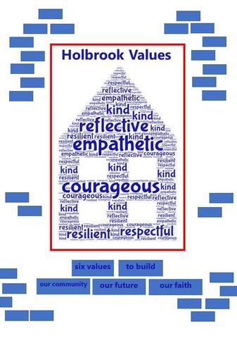 Our school and its curriculum is shaped by our Holbrook Values. These are the essential building bricks of life, to give children the tools to help them become successful and happy and to contribute to and shape their communities; the tools to help our children go on to 'live life in all its fullness'. Our values are grounded in the Christian faith. Each term we take a bible story and verse to help explore and think about one of the values.